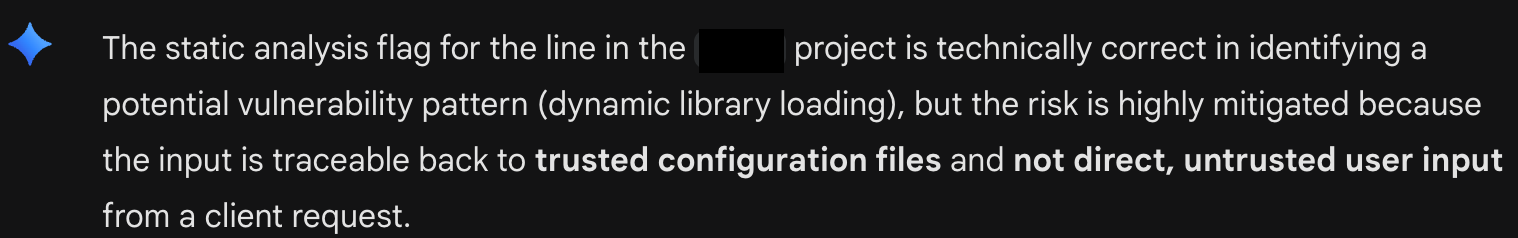 Here, Gemini 2.5 attempts to convince me that all is well with a particular line of code (see figure A: Gemini's Conservative Triage). It is rigid in its belief that since the code executed originates from a configuration file, it cannot be exploitable. The model attempts to close all intellectual doors for further investigation.