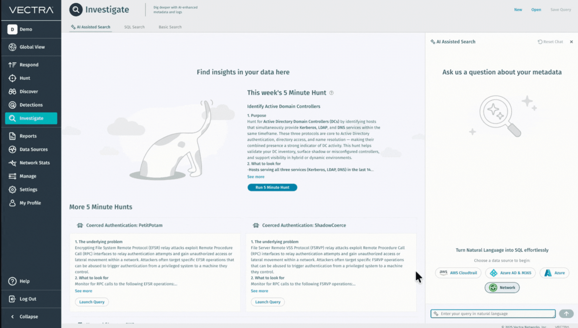 Hunting no longer requires deep technical expertise. With Vectra AI-Assisted Search, powered by Generative AI technology , analysts can ask investigative and hunting questions in plain language and get immediate, context-rich answers.